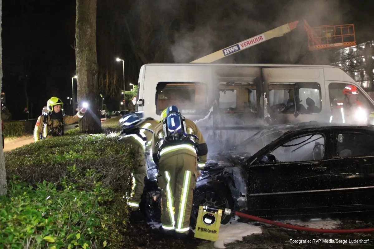 De brand werd binnen enkele minuten opgeschaald naar middelbrand. Bij aankomst van de brandweer bleek er een personenauto en een camper in brand te staan bij een flatgebouw.