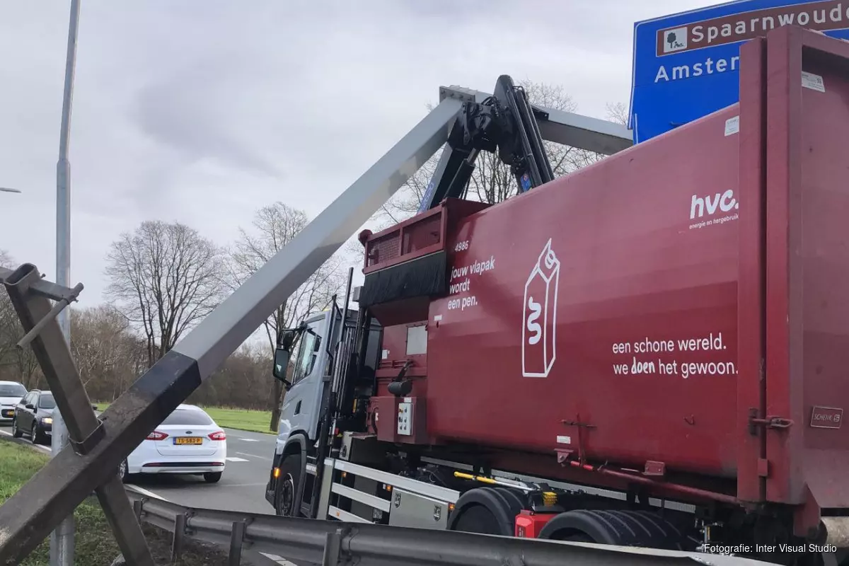 Een omstander laat NH Nieuws weten dat monteurs van de gemeente zijn opgeroepen om de stroom uit te schakelen. Op het moment dat de foto's werden gemaakt, leunde de constructie op de kraan. Twee rijstroken werden afgesloten.