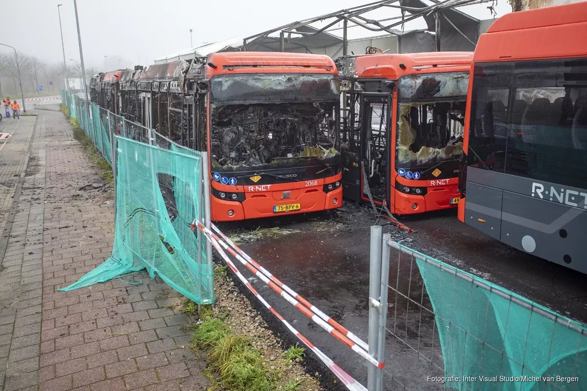 Het skelet van vier uitgebrande R-Net bussen zijn vanaf de Jan van Krimpenweg zichtbaar. Een gedeelte van de stoep is met politielint afgezet vanwege onderzoek naar de toedracht van de brand