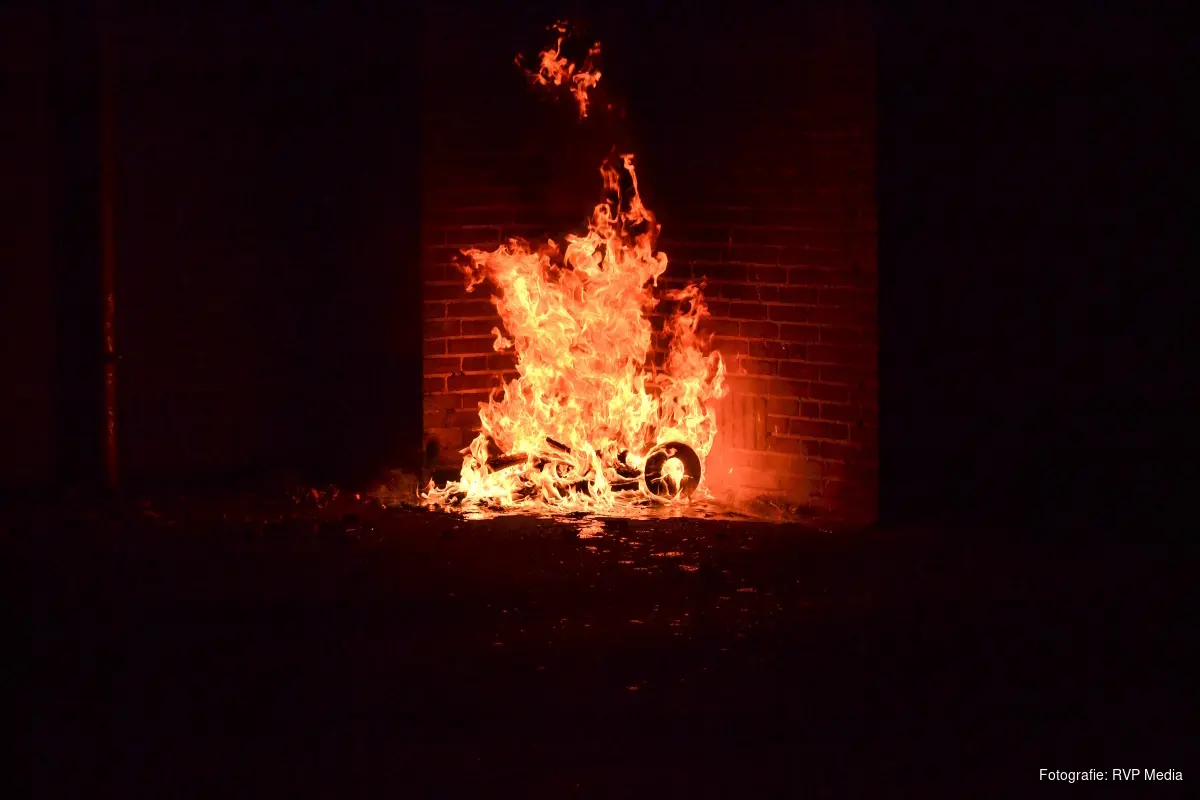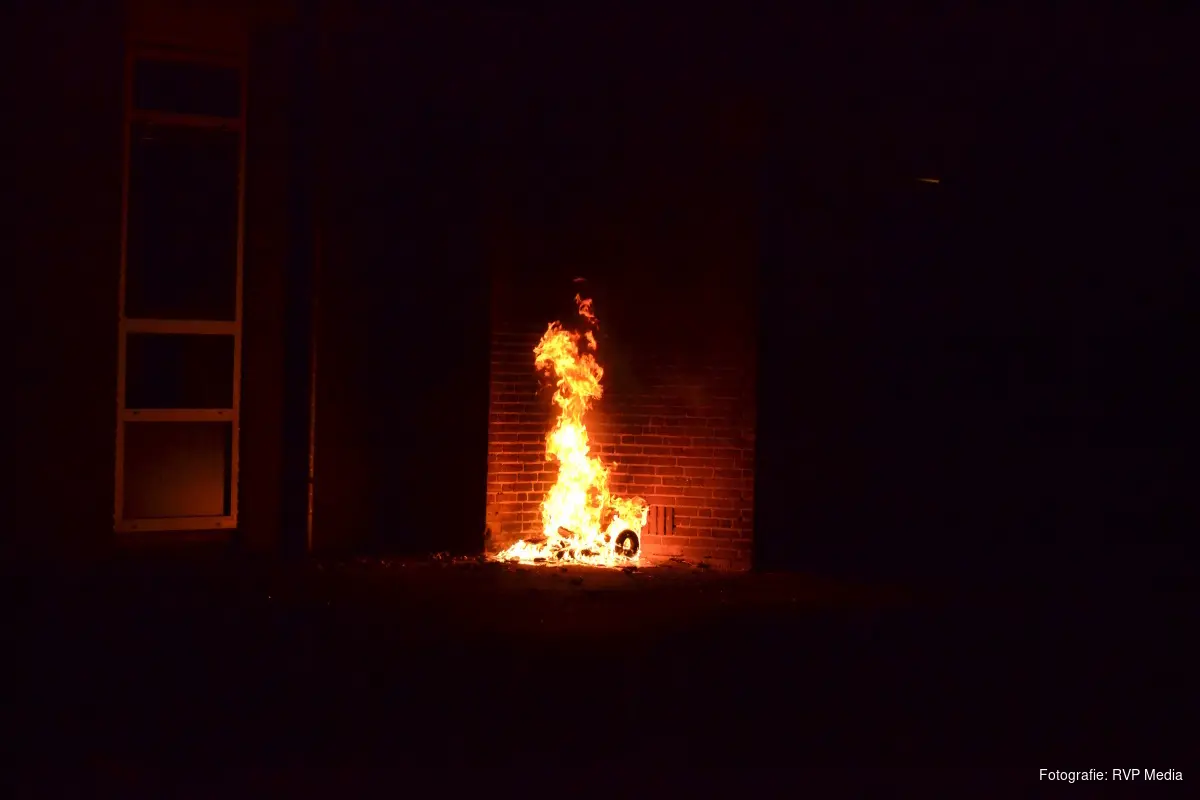 Bij aankomst van de brandweer bleek er een vuilcontainer welke tegen een woning aan stond volledig in brand te staan. De brandweer kon voorkomen dat de woning schade opliep door de brand.