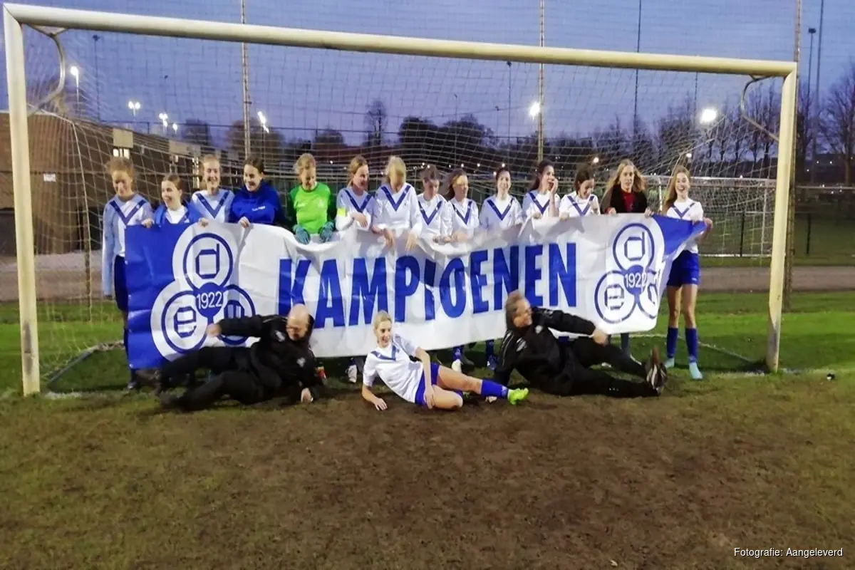 De trainers van de MO17-1 van de meiden van DEM kunnen heel erg trots zijn. Ongeslagen kampioen na een 2-0 overwinning op Haarlem-Kennemerland. Met 59 doelpunten en 8 tegen in 11 wedstrijden, waarvan er 10 gewonnen werden en 1 gelijk werd gespeeld, zijn de meiden terecht kampioen. GEFELICITEERD!