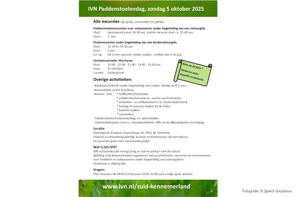 OVERVEEN - Op zondag 5 oktober verandert Buitenplaats Elswout in een waar herfstparadijs tijdens de jaarlijkse Paddenstoelendag. Een sfeervolle dag vol leuke en leerzame activiteiten voor jong én oud, georganiseerd door IVN Zuid-Kennemerland. Van boeiende excursies, speurtochten, lekker knutselen tot luisteren naar mooie verhalen.