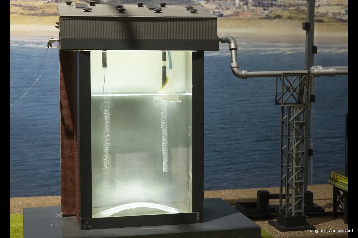 Er is een werkende demo om waterstof te maken. De waterstof wordt gemaakt door middel van elektrolyse en men ziet de waterstof bubbels van de elektrode komen.