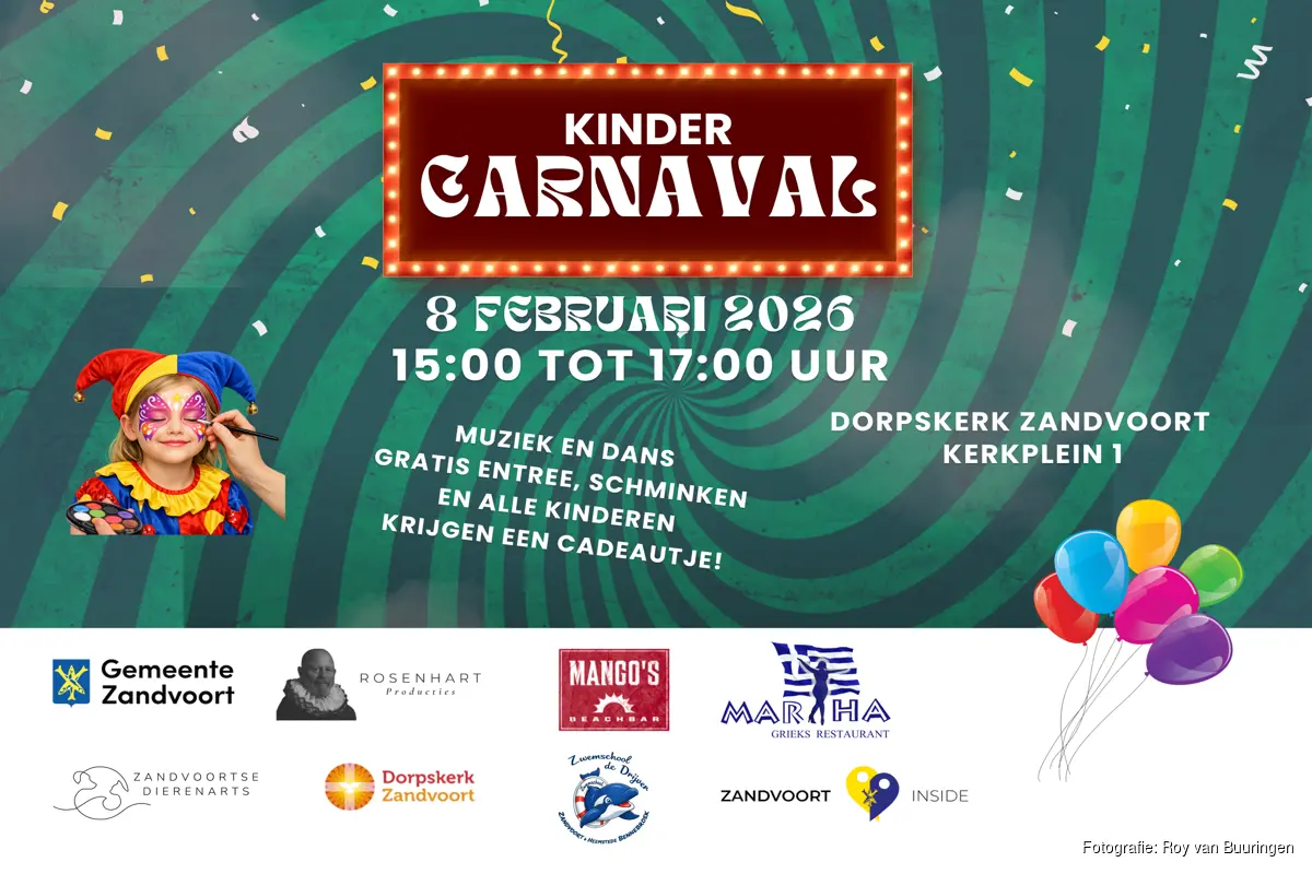 ZANDVOORT - Het is weer tijd voor kindercarnaval! Op zondag 8 februari 2026 vindt het jaarlijkse kindercarnaval plaats in de Dorpskerk van Zandvoort. Zandvoort Inside organiseert dit feestelijke evenement samen met een grote groep enthousiaste vrijwilligers. Het belooft opnieuw een vrolijke en kleurrijke middag te worden voor alle kinderen.