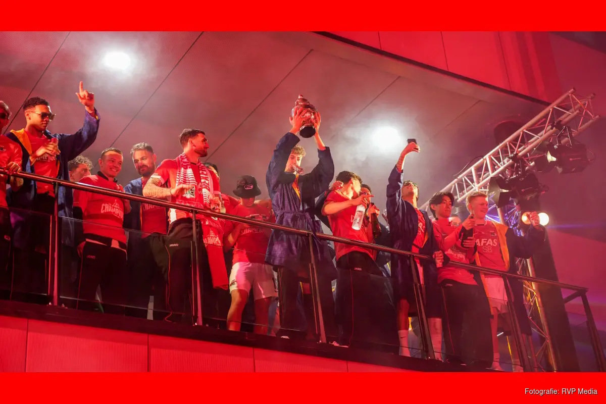 Bij het stadion stonden veel feestvierders te wachten tot de bus met daarin de spelers terug kwam vanuit Rotterdam.