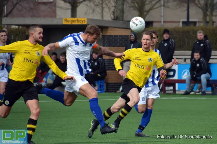 Reiger Boys wilde zich revancheren voor de harde nederlaag eerder dit seizoen en leek goed te beginnen toen Daan Prins al in de eerste minuut een vrije kopkans kreeg. Deze miste echter de kracht om keeper Lars Beukers te verrassen. In het vervolg van de eerste helft viel er bitter weinig te genieten op Sportpark De Wending. Mede door een stevige, frisse wind over het veld wwerd het rommelig met veel slechte passes en verkeerde keuzes aan beide kanten. Het duel werd opengebroken door een strafschop toen Sven van Langen een verkeerde terugspeelbal moest coorigeren en hierbij een overtreding beging. Justo van der Werff wist vanaf elf meter de bal, met enige moeite, in het doel te krijgen. Kort voor de rust werd een poging van Joep Kornblum nog door Jermaine Pichotte van de lijn gehaald.