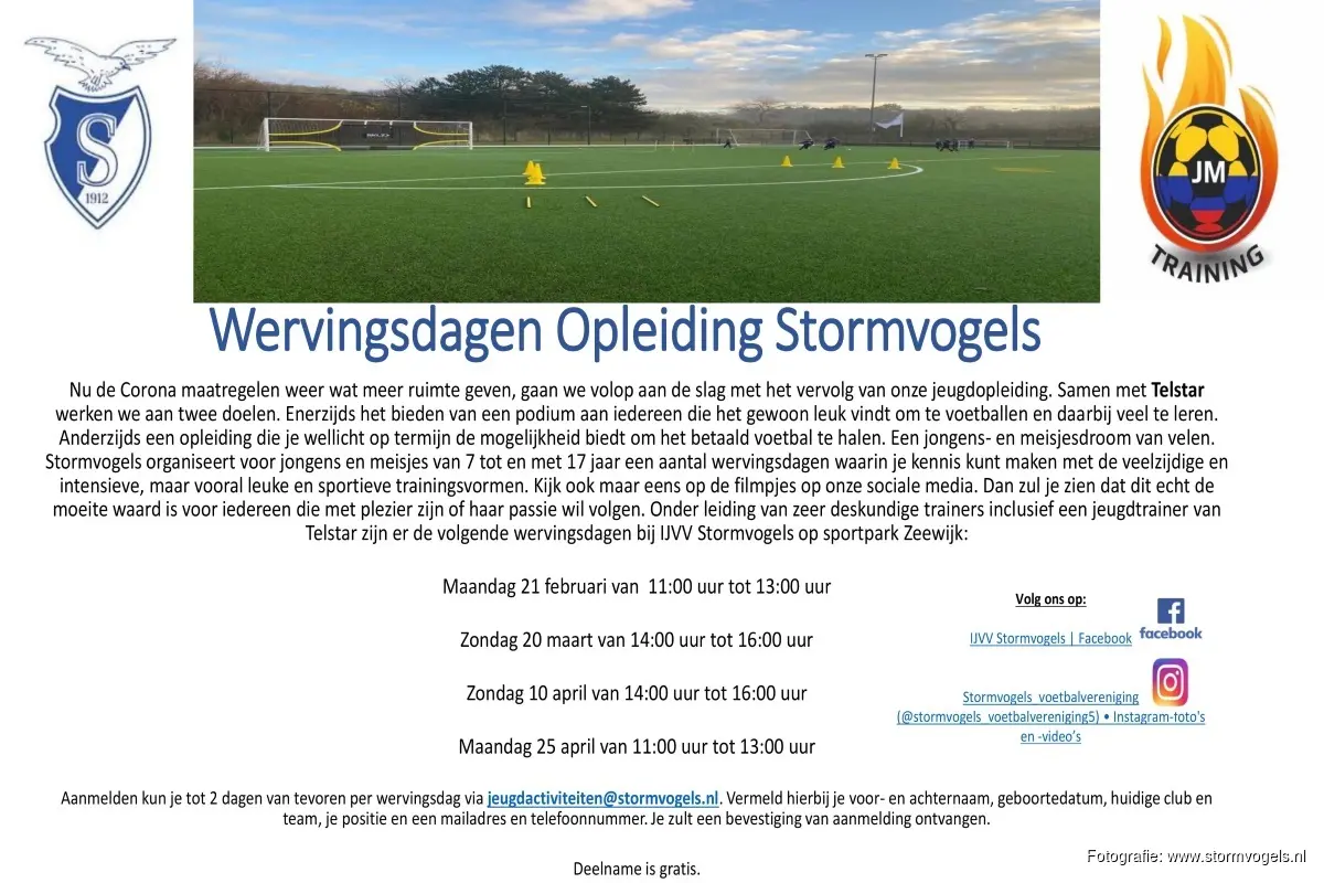 Onder leiding van zeer deskundige trainers inclusief een jeugdtrainer van Telstar zijn er de volgende wervingsdagen bij IJVV Stormvogels op sportpark Zeewijk: